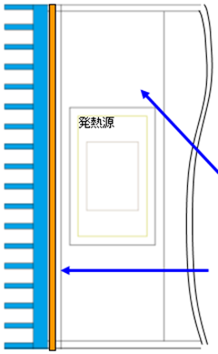 | 熱伝導による放熱効果は右のとおりであるため、 材料の熱伝導率・厚みの選定が放熱の鍵となる。 |