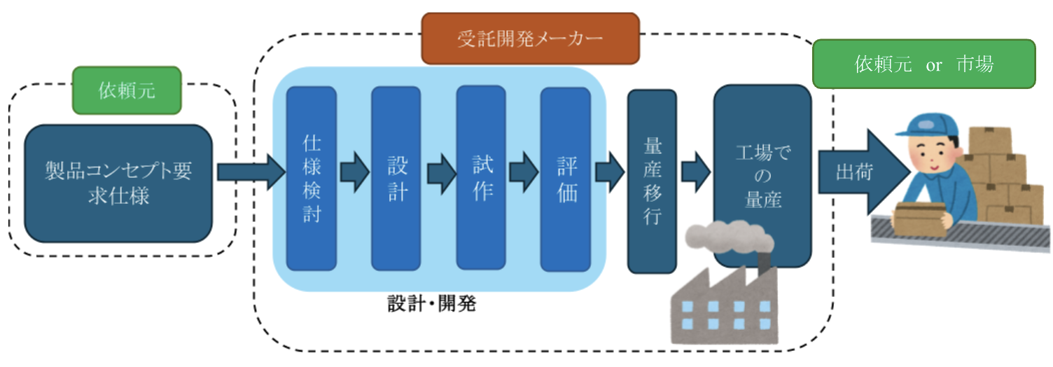 依頼元から、製品コンセプトや具体的な機能・性能などの要求仕様を受けて、受託開発メーカーが設計・開発、量産を請け負います。