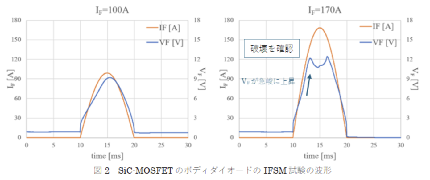 図 2に、ボディダイオードにピーク電流を制御したサージ電流IF(100 Aと170 A)を印加し、その時のVFとIFをモニタした波形を示しています。通常のIFSM試験では、サージ電流印加後のデバイス故障の有無で判定しますが、当社の試験では印加時の波形測定も承っております。