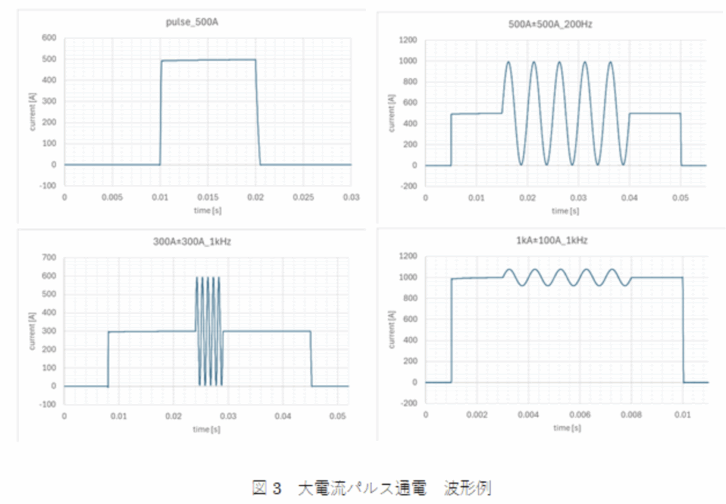 当社では、今回ご紹介したIFSM試験と同様に、試験対象物に対して瞬間的な大電流を印加し耐量を評価する受託サービスも実施しております。正弦半波だけでなく、矩形波等の任意形状の大電流パルス(図 3)を、ダイオードに限らず様々なサンプルに印加することが可能です。