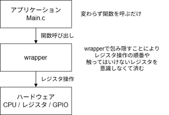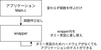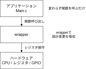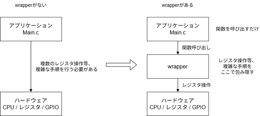wrapper(ラッパーと読みます)とは既存の関数・ドライバ・ハードウェア制御コード等を新しいAPIや別の形式で「包み込み(ラッピング)」することで、元の機能を修正することなく、利用しやすくする、他の環境への移植を簡単にする等を目的とした中間コード的な役割を持ちます。EOL(生産中止)対応などで、別のマイコンに移植する際にも効率化が図れます。