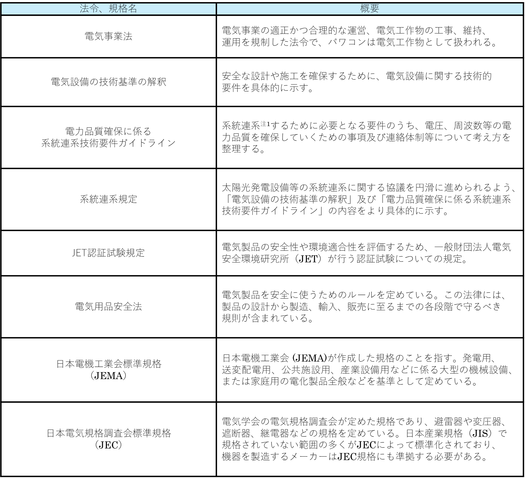 パワコンにおいても例外ではなく(表1)に示すとおり、主に準拠しなければならない法令や規格が多岐にわたります。