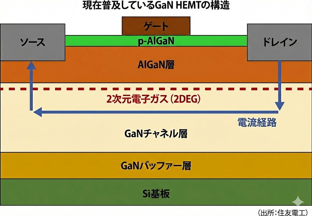 GaNパワーデバイスには大きく分けて横型と縦型の構造がありますが、現在広く普及しているのは横型GaN、いわゆるGaN HEMTです。GaN HEMTは、主にSi基板上にGaN層とAlGaN層を積層した構造をとります。AlGaN/GaNの界面ではヘテロ接合が形成され、分極の効果によって高い電子密度を持つ2次元電子ガス、すなわち2DEGが生じます。この2DEG層が電流の通り道となることで、低オン抵抗化や高速動作に寄与します。