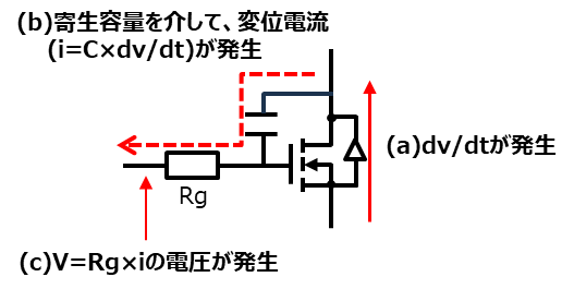 GaNパワーデバイスに限りませんが、FETには各端子間に寄生容量が存在します。高速スイッチング時にドレイン‐ソース間で大きなdv/dtが生じると、主にドレイン‐ゲート間の寄生容量、いわゆるミラー容量(Cgd)を介して変位電流が流れ、ゲート電圧が押し上げられることがあります。この結果、しきい値を超えると、意図しないターンオン、すなわちセルフターンオンが発生します。GaNデバイスは高dv/dtになりやすく、しきい値電圧が低い製品も多いため、Siデバイス以上にセルフターンオン対策が重要になる場合があります。