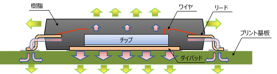 図2 QFP(Exposed die padタイプ)の放熱経路イメージ