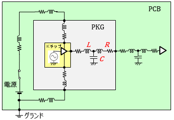 PKG及びPCBの電気特性モデルをICチップと回路接続した例を図2に示します。ノイズ解析では、PKGやPCBの設計データから電気特性モデルを正しく作成することが重要です。