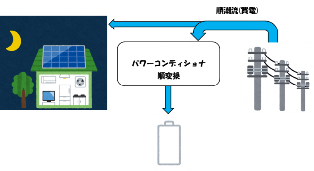家庭内負荷への供給も系統から行います。この時パワコンの動作は『順変換』の『順潮流』となります。