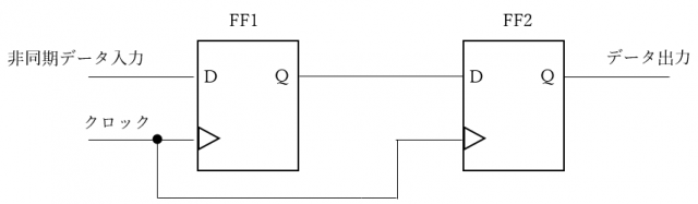 この対策としてフリップフロップをもう一段配置します。メタステーブルは一定期間で収束しますので、次のクロックの立ち上がりまでには安定します。よって、二段目のフリップフロップの動作には影響を与えません。
