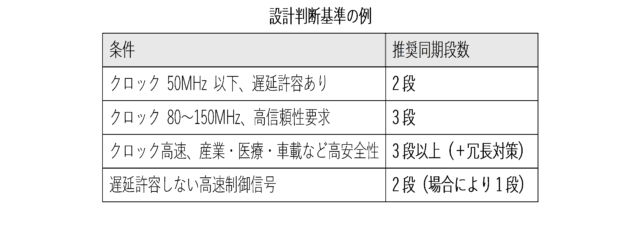 最適な同期段数は、クロック速度・安全性要求・遅延許容範囲・リソース状況 を総合的に見て判断します。