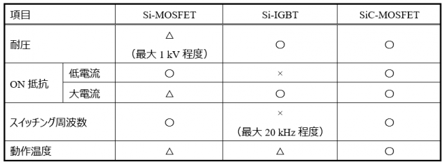 表1.Si-MOSFET・IGBT・SiC-MOSFETの比較例(600V以上の高耐圧品に見られる傾向)