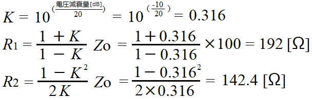 最初に電圧減衰率KはdB(対数)なので、真数に戻します。この回路のKは、0.316 です。
