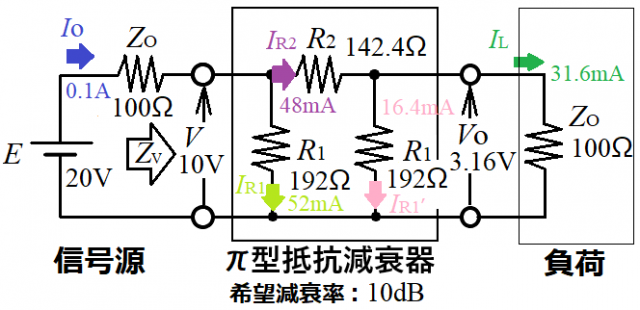 よしっ、ここで求めたR1=192ΩとR2=142.4Ωが、希望通り10dB減衰できているか、確認してみよう。信号源はE=20Vとしよう。確認方法は、総電流と各電流を求めるのじゃ。IR1とILがわかれば、Kが求まるぞ。