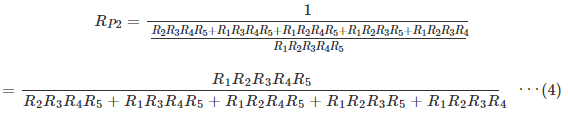 抵抗並列回路についてもう少しやってみましょう。 図3のような抵抗5本の並列回路の合成抵抗RP2はどのようになるかというと、抵抗並列回路の公式を用いて、