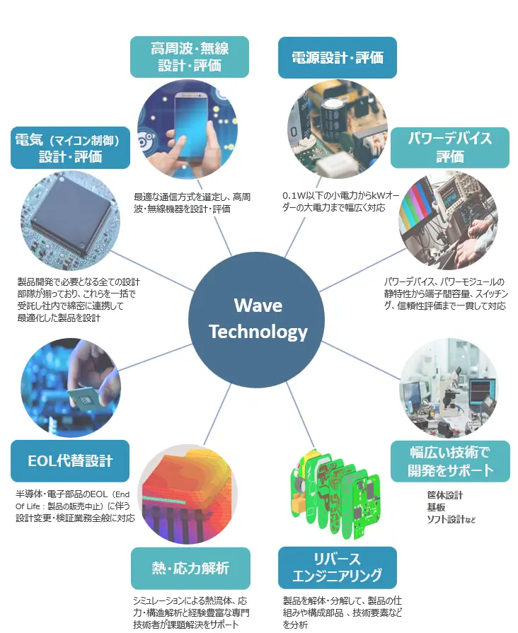 電気電子機器の設計において、回路設計から基板・筐体開発、ソフトウェア開発に至るまで幅広い技術領域をカバーした多種多様なサービスを組み合わせたワンストップサービスを提供しています。顧客の多様な要求に合わせた柔軟なカスタマイズを可能とし、最適な仕様と確かな設計品質でお客様の製品開発に貢献します。